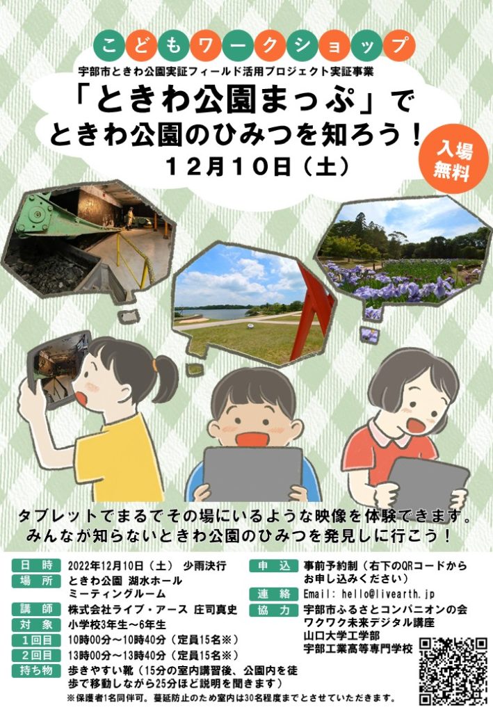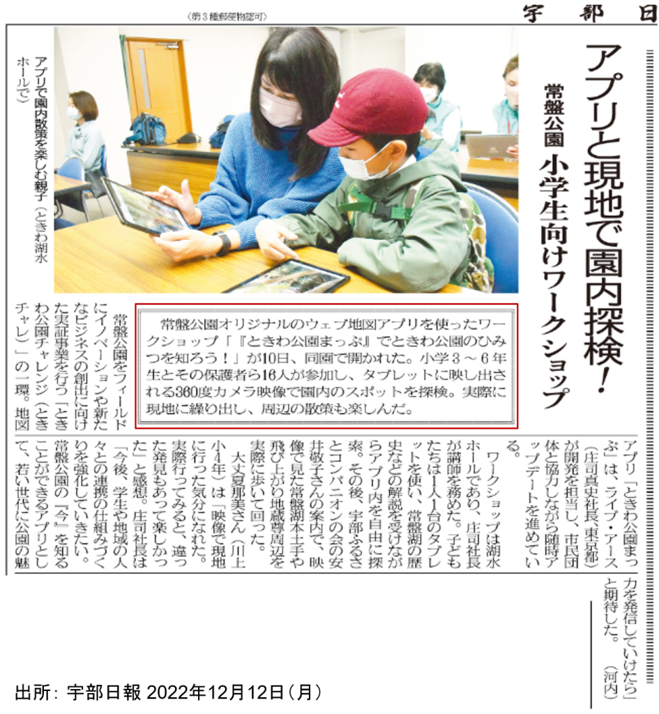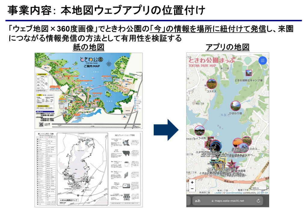 山口県宇部市のときわ公園をフィールドに、ビジネス創出の新しい革新的な取組み従事する「ときわ公園チャレンジ」に参加し、「ときわ公園の地図ウェブアプリ」の開発実証事業を提案。書類選考、宇部市民の前でのプレゼンテーション大会を経て、当社提案が正式採択されました(30件中4件)。2023年2月末に、無事に本取り組みを終了し、本事業期間内で改善を繰り返し、当初提案した仕様・基本機能を実装し、アプリを活用したデータ取得および分析・考察を提出しました。