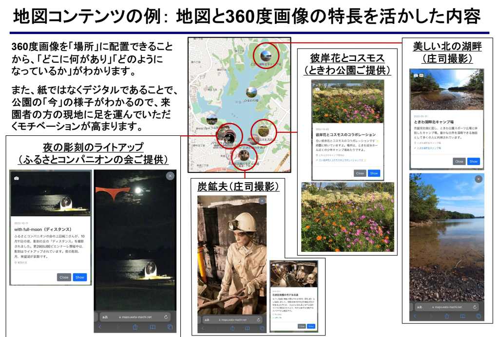 また、本アプリを活用し、様々なコンテンツをアップロード・表示し、それらへのアクセス数を取得し集計した結果、本アプリを活用した子ども向けワークショップのフィードバックからは、「ウェブ地図で位置を確認する」「360度画像で臨場感を伝達する」「バーチャルとリアルをつなげることで理解が深まる」点について、本ウェブ地図アプリの有用性が示されました。