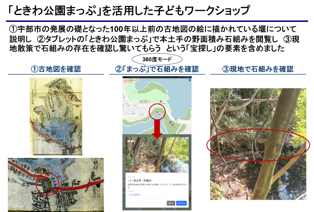 なお、本アプリの活用に関して、ときわ公園職員以外に、宇部市ふるさとコンパニオンの会および山口大学工学部との連携ができ、地域協力が得られたことは、本事業の大きな成果となりました。山口大学工学部で本アプリを活用したジオロケーション・コーディングの講義をした結果、興味を持った学生がときチャレに参加してくれました。子どもの多くは何らかの収集に興味を持っていると考えられているが、ときわ公園などの広いフィールドで発見できる虫や動物を、本地図アプリで共有し合う、という構想にも発展しました。